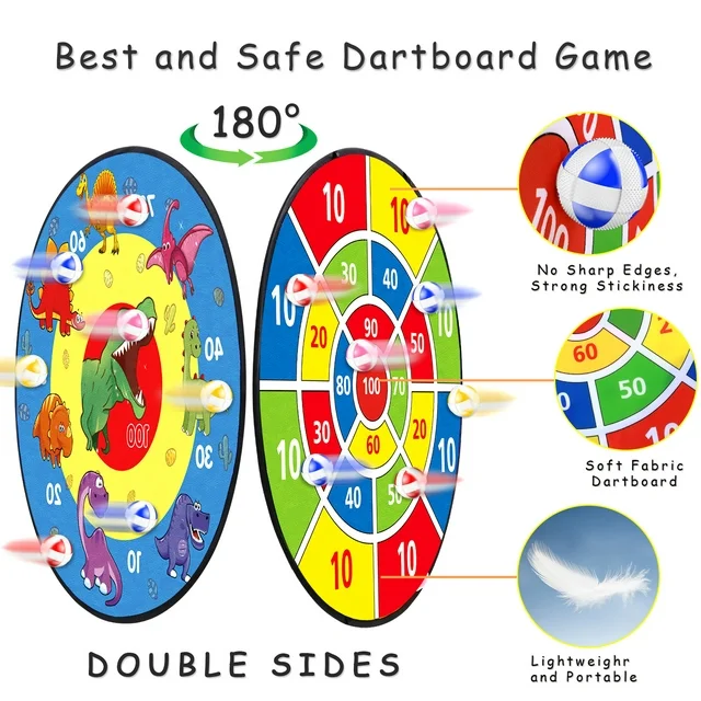 •  1.8" SUPERSIZE STICKY BALLS: You will realize that a large sticky ball can create a joyous atmosphere for the party. Each darts board set contains 16 colorful sticky balls (4 blues & 4 reds & 4 yellows & 4 pinks). High quality and safe hook-and-loop ball ensures that the ball can be 100% firmly attached to the board.