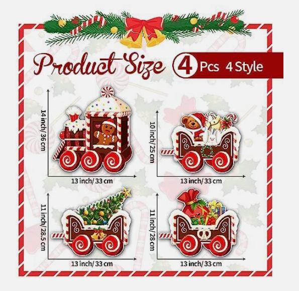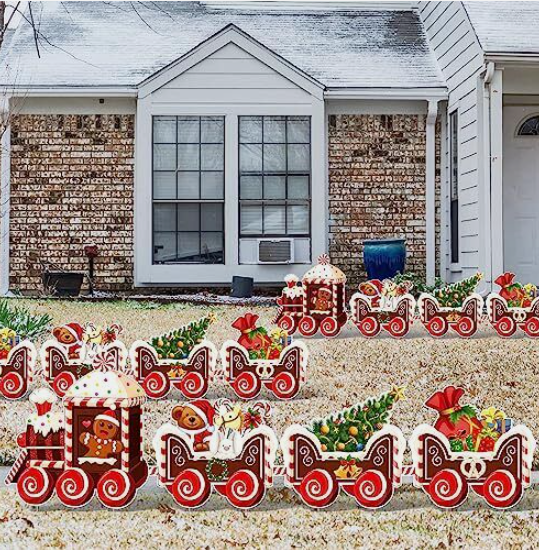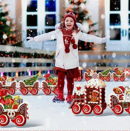 These Christmas train outdoor lawn signs are designed with gingerbread man, Christmas tree, bear, gift box and more, which are classic Christmas elements, easy to set off a happy and warm atmosphere.