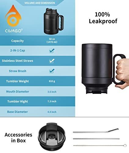 50 Oz Insulated Tumbler Mug with Lid and Straw Vacuum Travel Coffee Mug with Ha