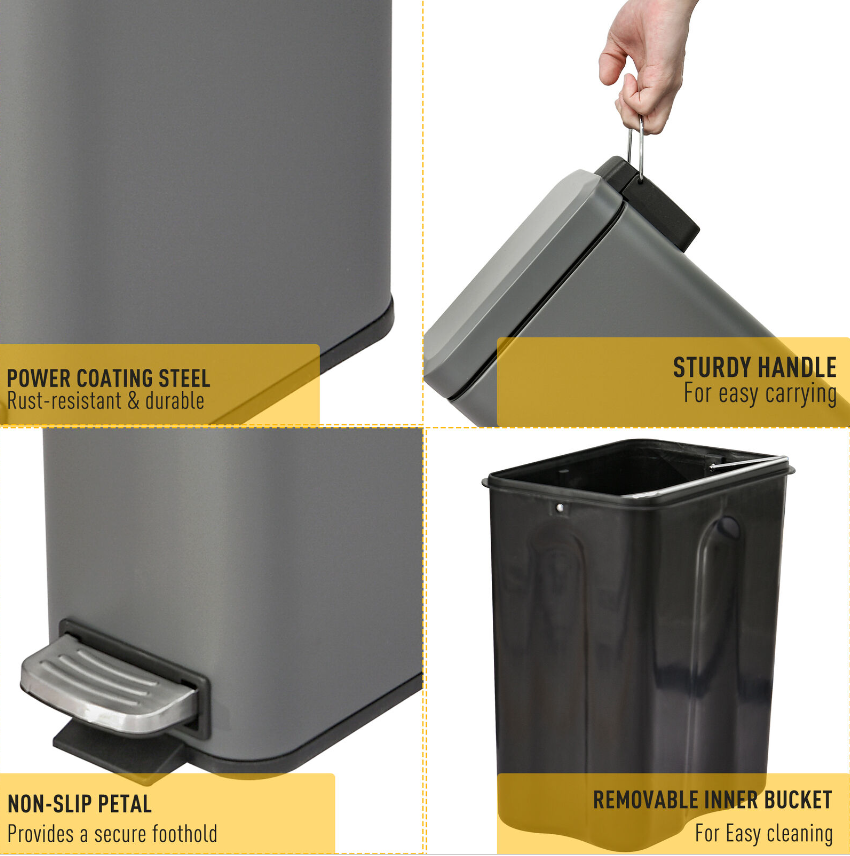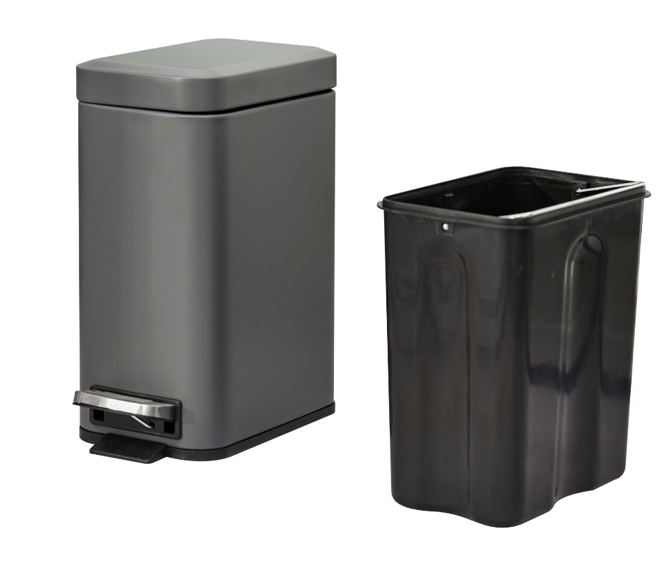 • Tough and durable steel body, with a powder coated for extra strength for everyday use • Stylish rectangular shape in a fresh grey to blend in beautifully with your home • Inner removable bucket with handle for easy and hygienic cleaning • Soft and quiet opening lid, operated by the large and easy-use foot pedal • Anti-slip bottom to keep the bin stable (can be knocked over when kicked or hit) • Small and compact size is perfect for even small areas in the bedroom, bathroom, office and beyond • Maximum capacity: five litres, lid maximum weight: 5kg • No assembly required, simply unpack and use!