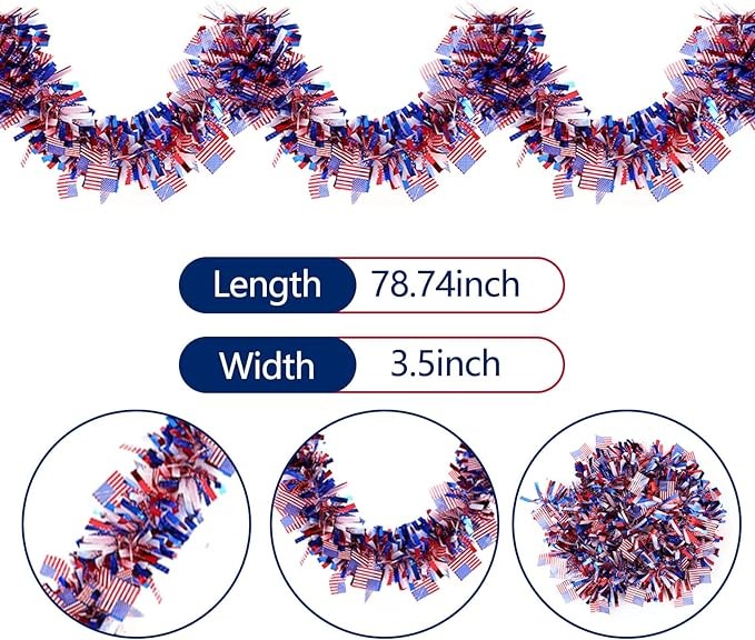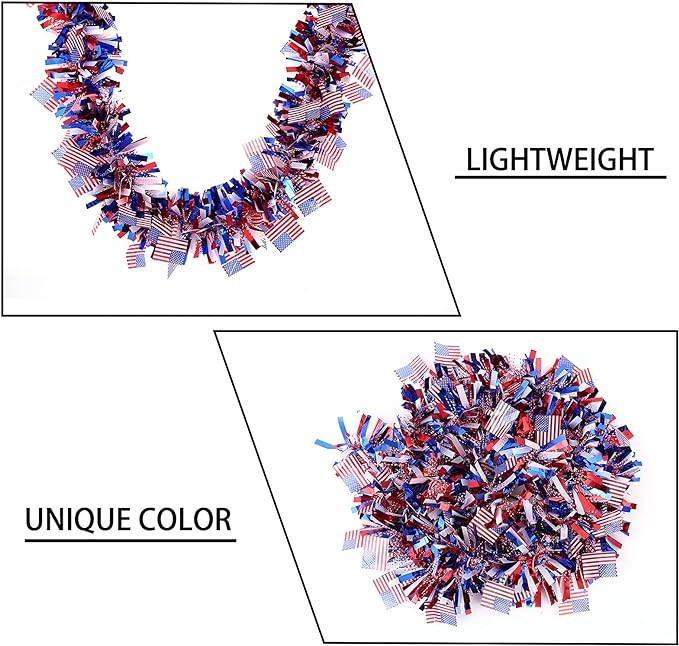 • 【Material】: The Memorial day ornaments tinsel garland is made of PET plastic, not easy to damage or fall off, Eco-friendly, durable and no toxic smell, lightweight and reusable, independence day hanging decorations can with stand the long time use for Memorial day.