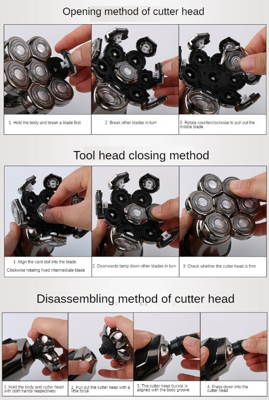 The cutter head is detachable.Pull up the shaving head, you can easily remove it, and then install other heads you need. It is easy to use and wash.