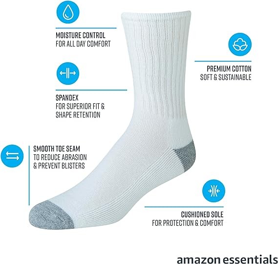 • MATERIAL: Amazon Essentials socks are made from high-quality and durable materials. These socks are a cotton-poly blend with elastane for superior fit and shape retention.