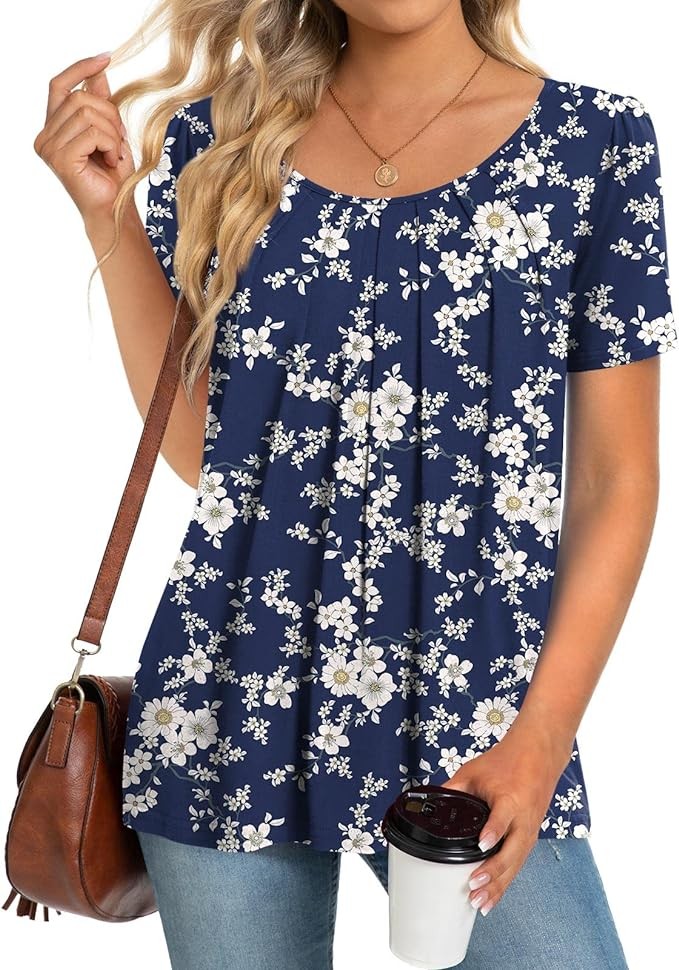 Anymeet 2024 Women's Summer Tunic Top Short Sleeve Casual Tshirts Pleated Loose Blouses for Leggings