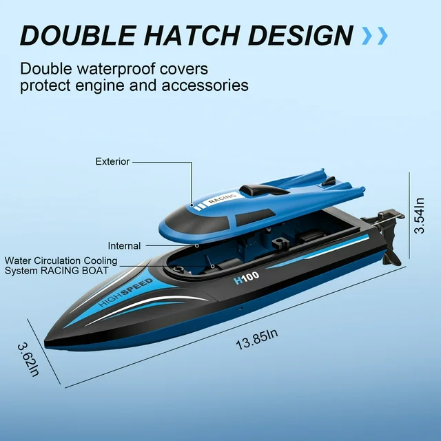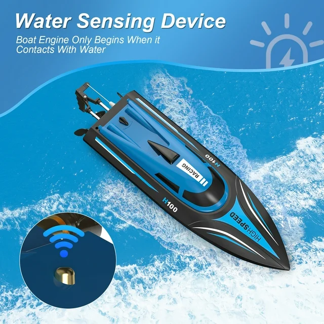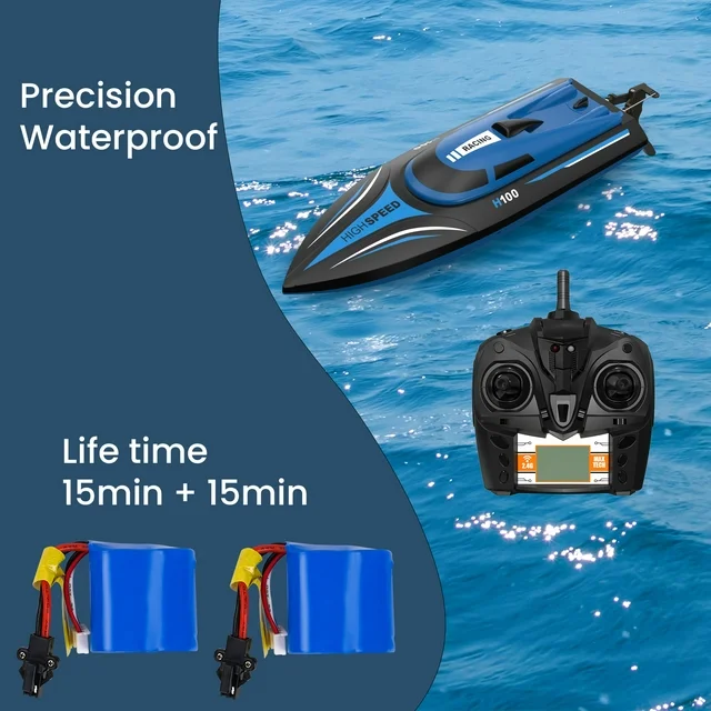 • High-speed Remote Control Boat:  H100 RC boat for adults and kids races across the water at up to 20 mph. This high-speed boat submarine toy is equipped with a 4-channel 2.4 GHz remote with a 150-meter signal range.