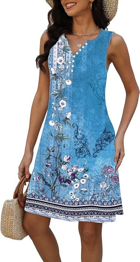 • Features: Sleeveless dress, button down,V Neck ,knee length,Boho Floral Print ,Solid Color,beach sundresses vacation,Bohemian sun dress casual with pockets,swing hem.