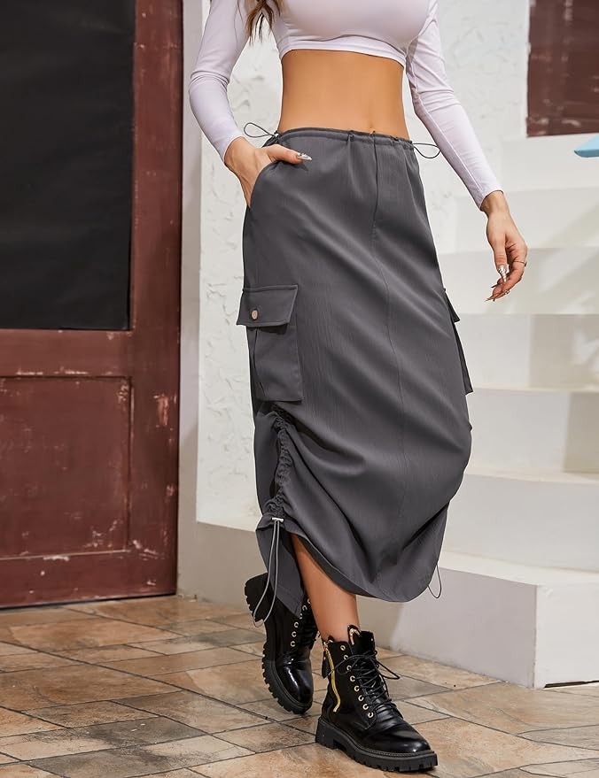 Design: Solid color skirt,long cargo skirts with drawstrings for women,cargo long skirt with pockets,long skirt y2k fashion skirt,causal cargo skirt,Y2K cargo skirt, drawstring pleated skirt, midi skirt with slit,low rise skirt,cargo maxi skirt