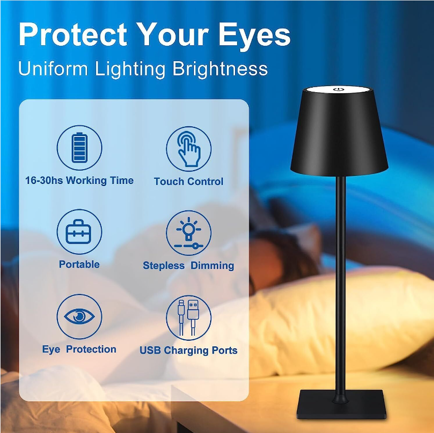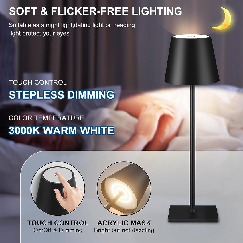 【PROTECT YOUR EYES】:Cordless desk lamp is designed with round light source, 360 degrees uniform illumination brightness, you can adjust the brightness freely according to your needs. And we use flicker-free high quality LED beads to ensure brightness and more comfortable for your eyes.
