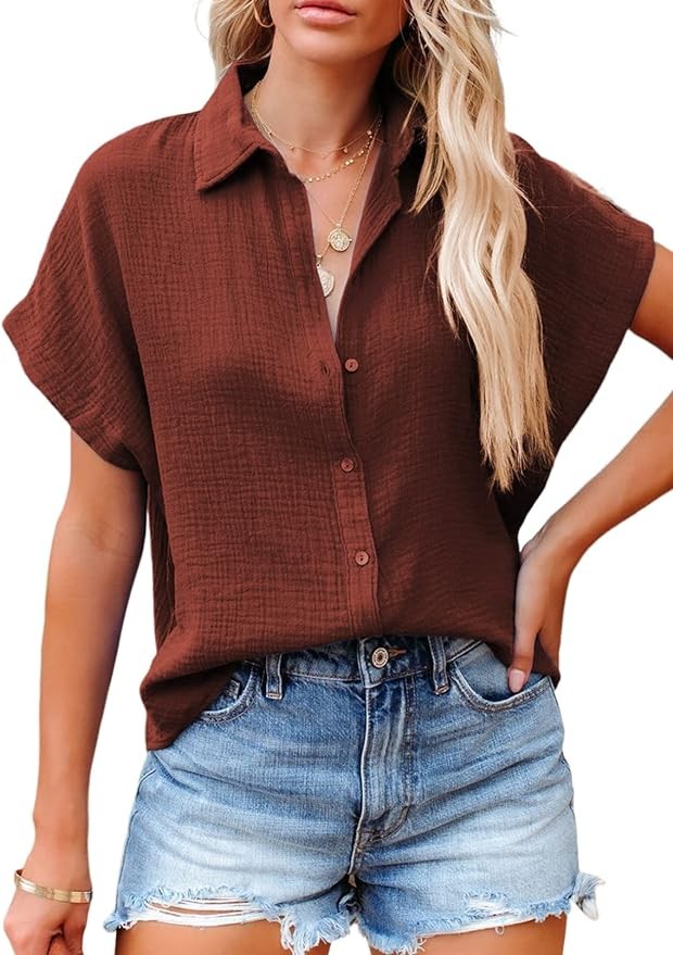 Dokotoo Casual V Neck Button Down Shirts for Women Solid Short Sleeve Blouse Tops