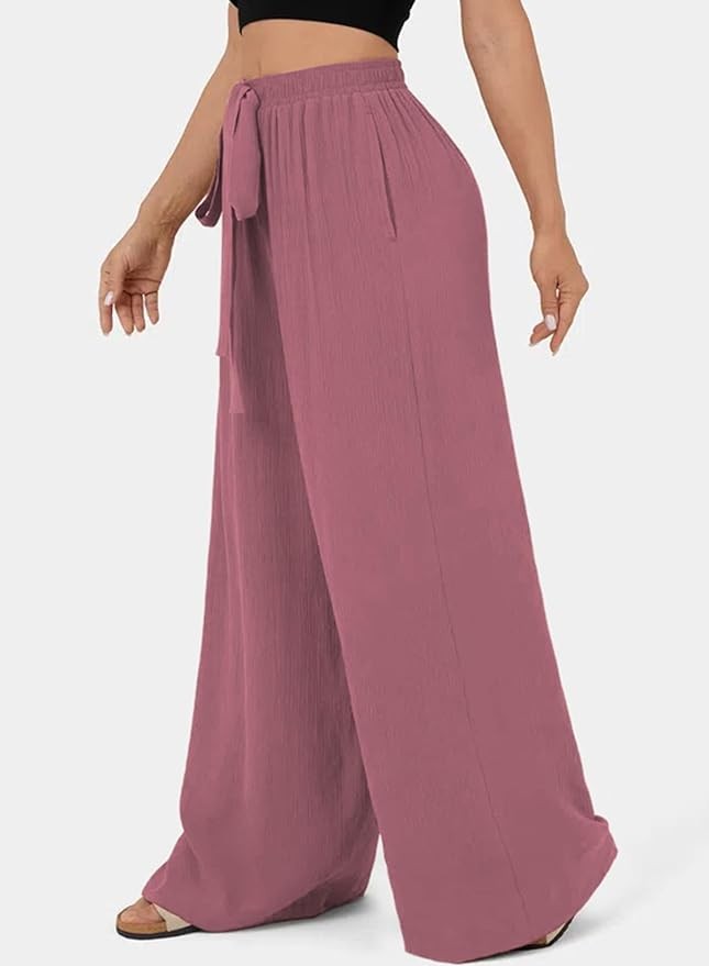 Dokotoo Womens Elastic High Waist Wide Leg Pants Flowy Casual Loose Slant Pocket Spring Summer Solid Trousers