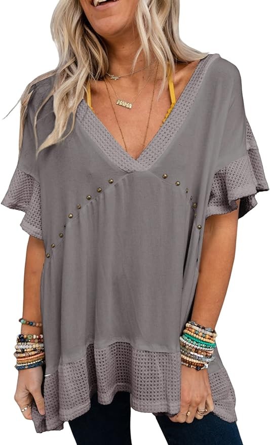 Chic Style: This top features patchwork and rivet decoration, making it adding a touch of style to your look,loose casual ordinary ruffle sleeve loose waist shirt, irregular high and low hem T-shirt, add a sense of fashion for your collocation.The V-neck design enhances the neckline and creates an elegant, slimming effect.