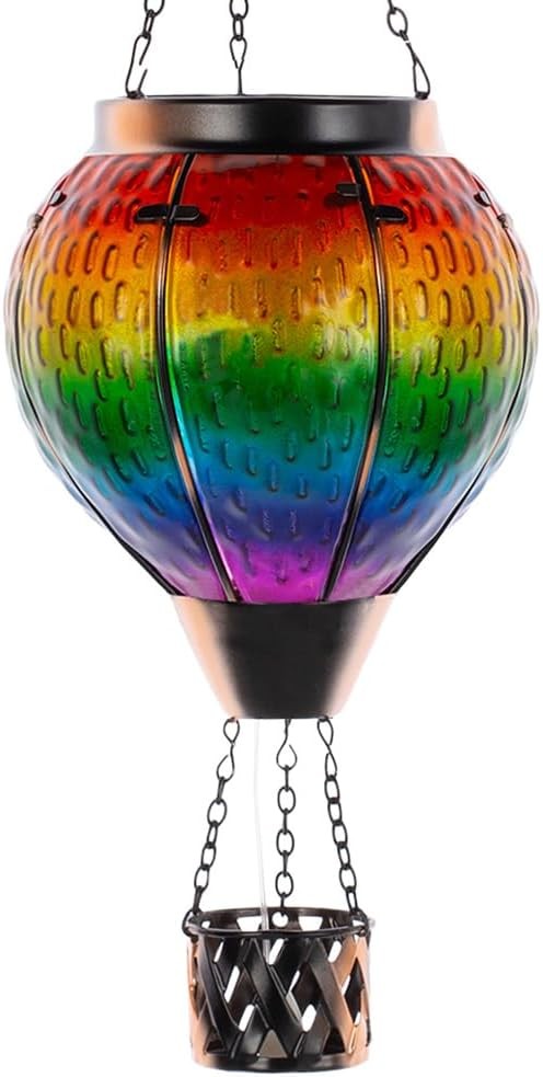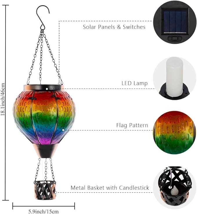 • ? [Hot Air Balloon Solar Lantern] The solar lanterns outdoor waterproof has a unique design that incorporates the classic elements of a hot air balloon. Its shape resembles a hot air balloon floating in the air, with a candlestick hanging below. Coupled with the flickering flame design and rainbow-like colorful gradient colors, the outdoor lantern is full of dreamy atmosphere, creating a warm and romantic atmosphere for your garden.
