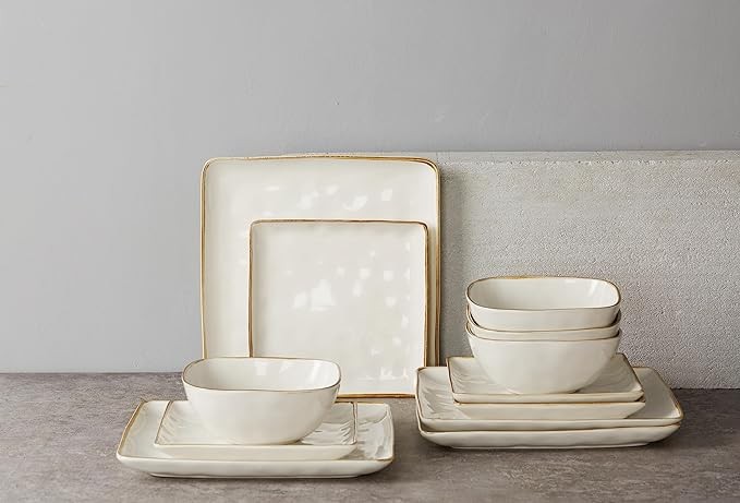 • 【12-Piece Dinnerware Set】This dish sets service for 4 that includes 4 large square 9.75 inch dinner plates, 4*7.25 inch salad plates and 4*6 inch cereal bowls. This kitchen plates and bowls set meet the need of your family perfectly.