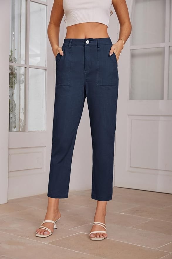 • FEATURES: S=US 4-6, M=US 8-10, L=US 12-14, XL=US 16 / Women’s Pants / Womens Casual Pants / Zipper Closure / Elastic Waist In The Back / Tapered Pants / Cropped Length / Slanted Pockets / Cotton Pants for Women / Decorative Pocket Flaps at Back/ Soft Material / Solid Color