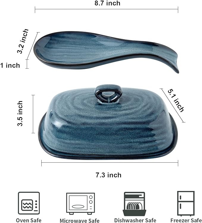 VERSATILE AND EXQUISITE DESIGN: The spoon rest and butter dish is designed with blue reactive glaze which can add a modern touch to your home. And the spoon rest can use to place kitchen utensils, such as fork, knife, spatula, ladle and tong. You can use the butter dish to keep your butter fresh.
