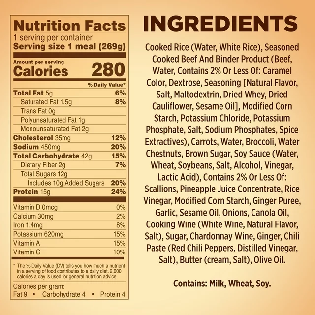 Tender beef strips with rice carrots, broccoli and water chestnuts in a sweet teriyaki sauce