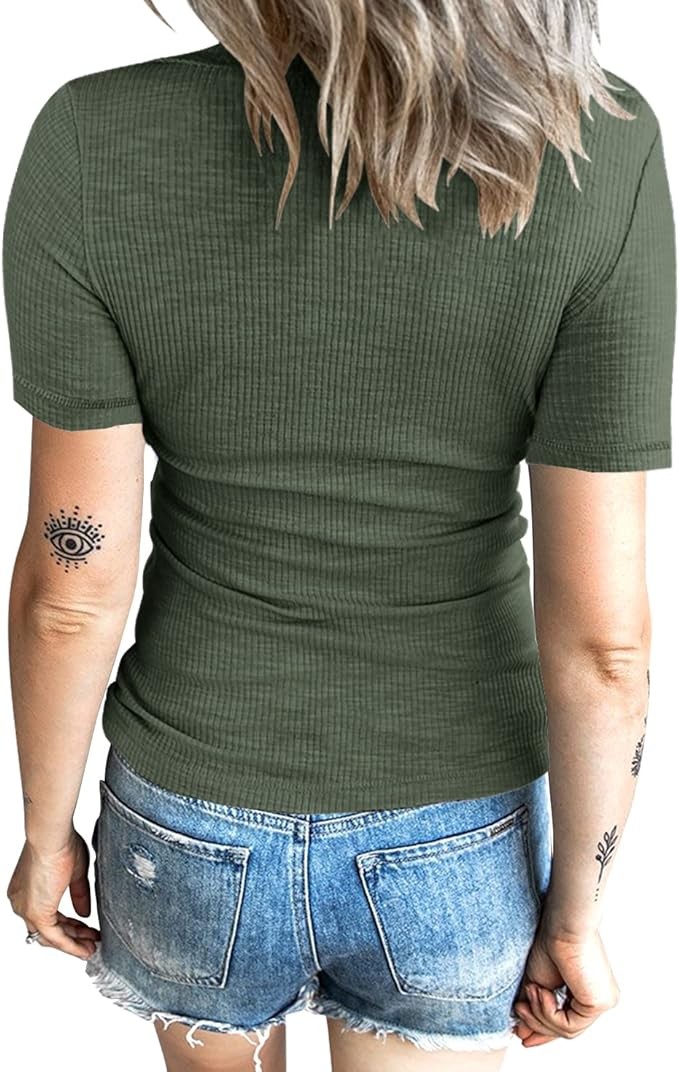 Short Sleeve Shirts with V-Neck,Ribbed Knit Structure, Plain-colored Design,Front Criss Cross Designed at Neckline,Curved Hem, Super Chic and Fashionable.