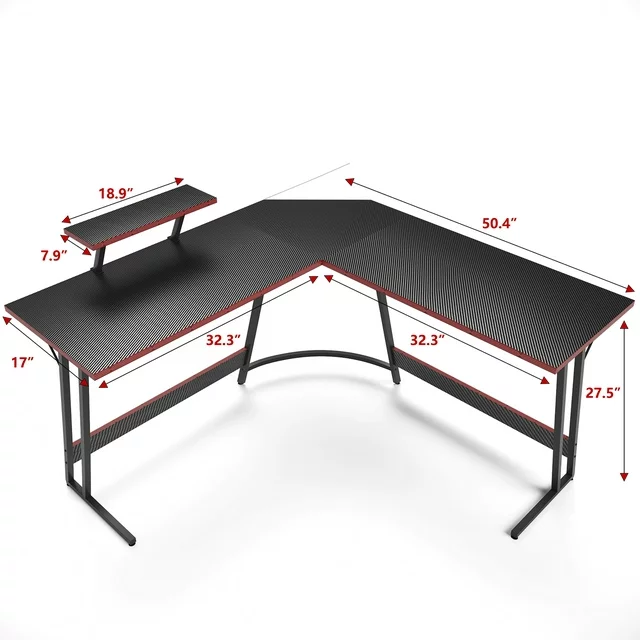 • Large Gaming Surface: This corner desk with 50.4"L x 17"W double desktops ensure your conversions around with ease while working/gaming. Equipped with a full monitor stand, this gaming desk provides ample space for other gaming devices in addition to the monitor, mouse, and keyboard, allowing you to operate and enjoy the thrill of victory.