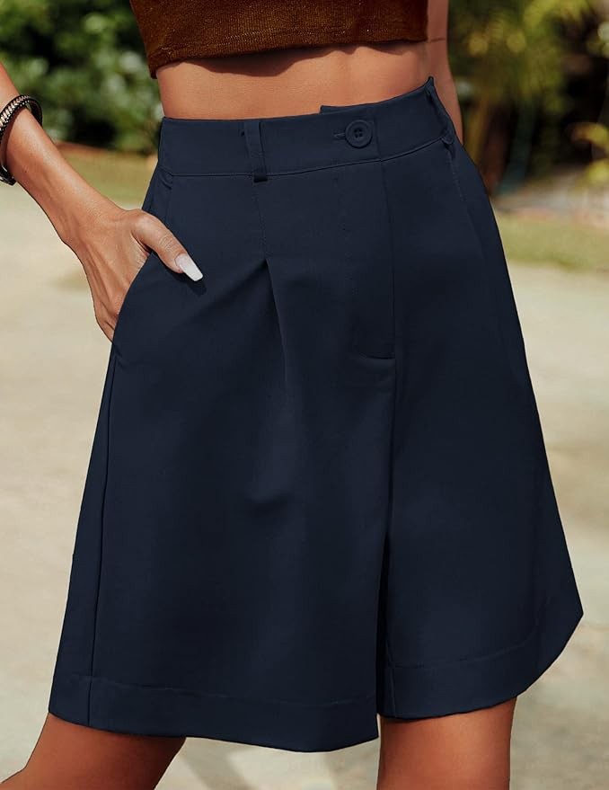 • PREMIUM MATERIALS - 80% Polyester, 16% Rayon, 4% Spandex, won't too soft, cool shorts and comfy shorts, create a crisp and sleek look. Flowy Bermuda shorts for women, summer shorts for women, dressy lightweight shorts for women, pleated shorts women.