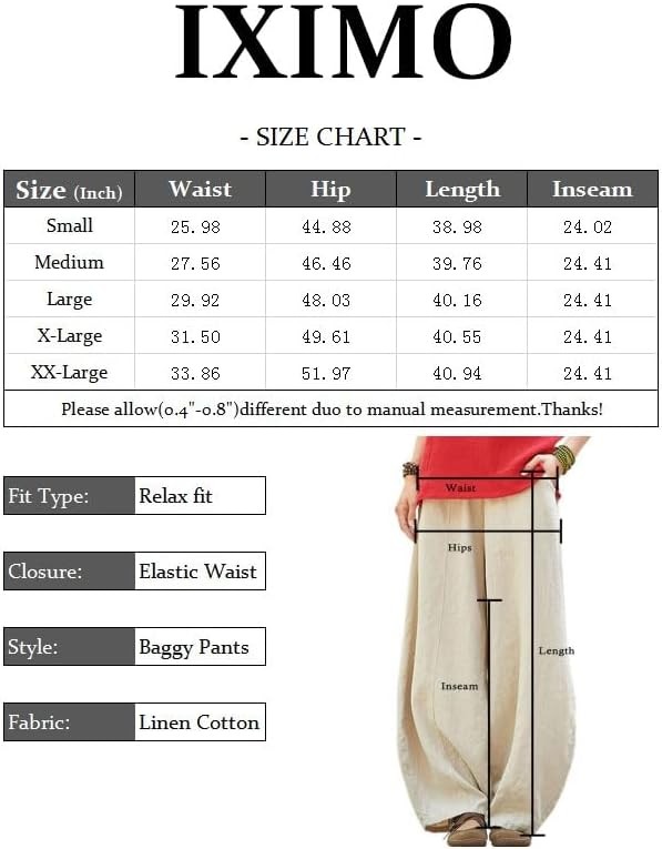 IXIMO Women's Casual Cotton Linen Baggy Pants with Elastic Waist Relax Fit Lantern Trouser