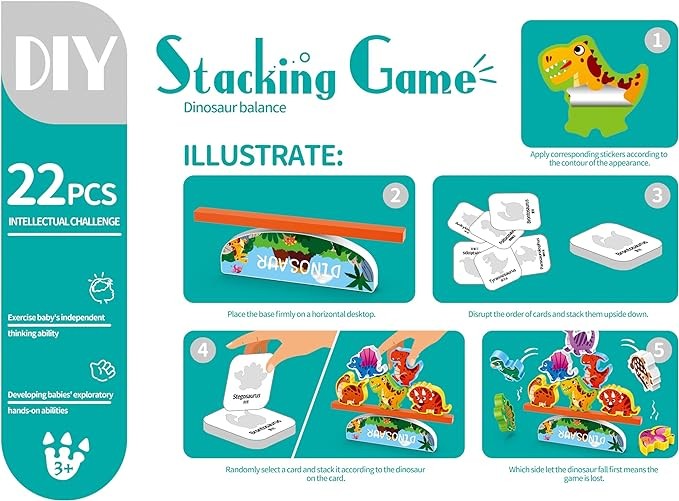 【HOW TO PLAY】Fristly (DIY) : Child use sticker to cover the plastic shape for dinosaur ( DIY )Secondly ( Montessori Alphabet Educational Learning ): can put the dinosur on the card to fix exaclty shape of dino , and another side of card is dino's name and photo .Thirthdly ( Balance ): pk game to play for balance game .