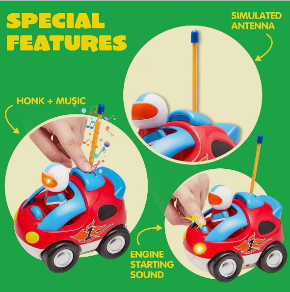 • Feature: RC Car Will Make Honking Sounds Radio Music and Flashing Headlights to help your children develop Sound Discrimination Ability. The ergonomic design is suitable for Baby Grasping, training their Finger Flexibility.
