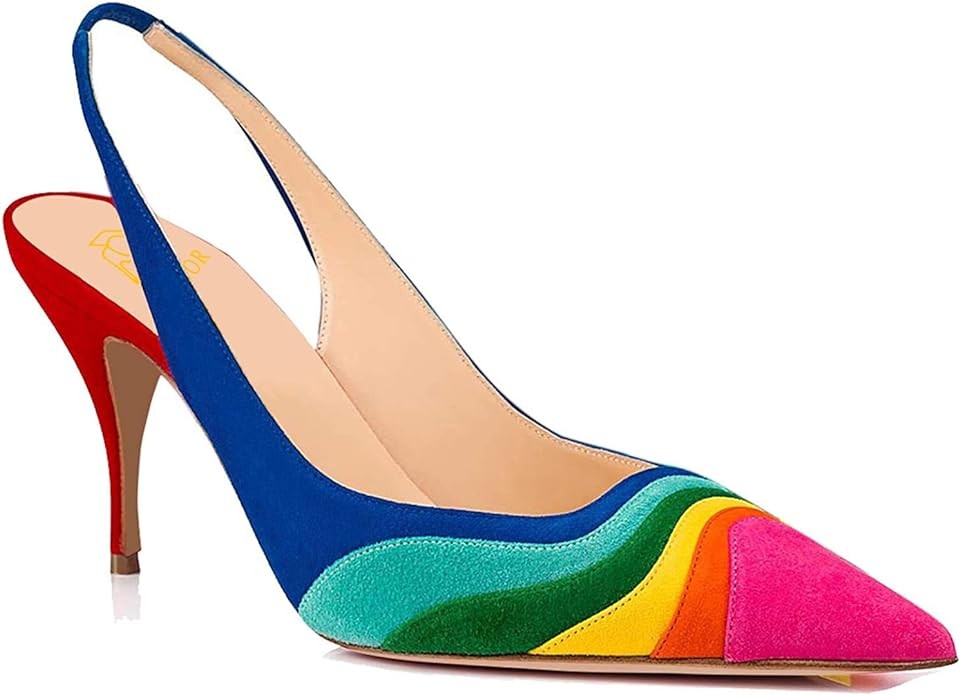 LEHOOR Women Rainbow Slingback Pumps Kitten Heels Pointed Toe Suede, Multicolor High Heel Pumps Stiletto Elastic Strap Closed Toe for Ladies Dress Party 5-13 M US