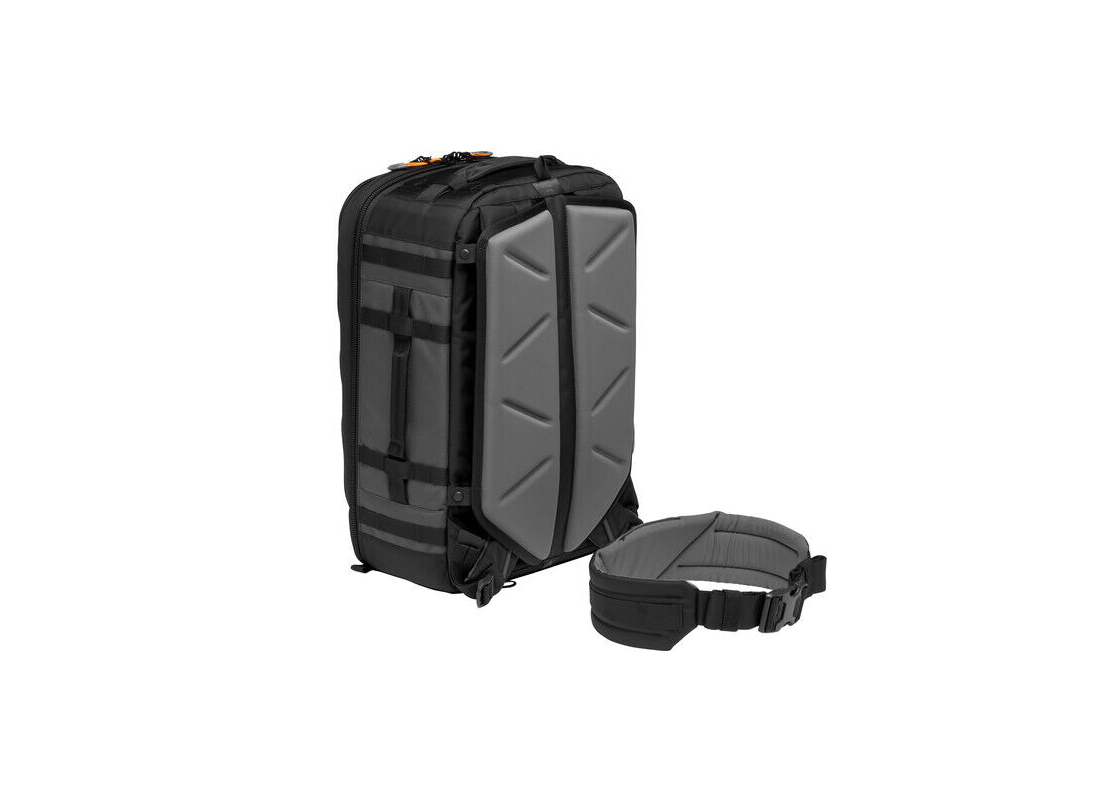 The Pro Trekker BP 350 AW II can be carried using its built-in haul handle, the side handle, or by its adjustable shoulder straps. When traveling over difficult or uneven terrain, the backpack's waist belt transfers weight to the hips for additional comfort, while a built-in sternum strap buckles the shoulder straps together, further limiting unintentional shifting around the wearer. To help ensure that the Pro Trekker BP 350 AW II meets the carry-on requirements for most international and US airlines, the waist belt is detachable while the shoulder straps can be stowed behind the backpack's rear panel.