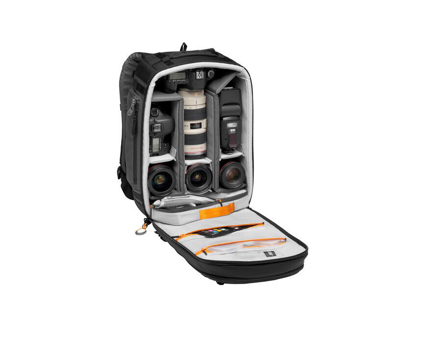 This black Lowepro Pro Trekker BP 350 AW II Backpack is a rugged bag that is designed to comfortably and securely carry your mobile photo studio while meeting the carry-on requirements for most international and US airlines. Its spacious main compartment features an adjustable partition system with 11 dividers that can fit a DSLR or mirrorless camera with a 70-200mm f/2.8 lens, three to four additional lenses, a shoe mount flash, and a backup camera. Alternatively, the main compartment can be configured for a DSLR or mirrorless camera with a 70-200mm f/2.8 lens, as well as a folding drone kit. To enhance the ability to organize this backpack's contents, a Lowepro Gear Box equipment pouch is included. Cords, adapters, and other essentials for the devices carried by the Pro Trekker BP 350 AW II can be inserted within the Gear Box, keeping them organized under the partition system.