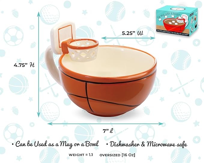 • Big Basketball Mug – Interactive basketball coffee mug with mini hoop. Oversized cup or basketball bowl. Fun for tossing mini-marshmallows into hot cocoa, cereal into milk etc.
