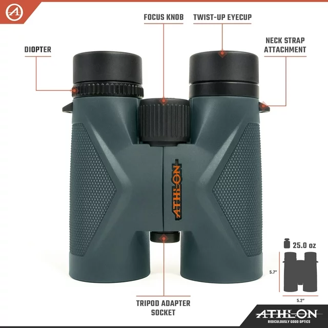Connect and spend quality time with the outdoors. Whether an avid bird-watcher or hunter, keep a close eye on your target with Athlon Optics Durable Compact Midas 8x42 Lightweight Roof-Prism UHD Binoculars. Set the rugged benchmark for all-weather brightness and clarity with these light and slim binoculars. Intelligent features such as extra-low dispersion glass lenses, advanced fully multi-coated optics, BaK-4 prisms with ESP dielectric coating, plus phase coating, these binos gather maximum light and produce brilliant color fidelity. Design enhancements include XPL lenses coating that protects the exterior lenses from scratches, dust, and anything else Mother Nature throws at you. Prevent eye strain with twist-up eyecups and see the entire field of vision. The waterproof, shockproof design, and rubber armor ensure these binoculars are ready for anything you are. No matter the conditions, the outlook is clear with Athlon Optics Midas Roof-Prism UHD Binoculars.