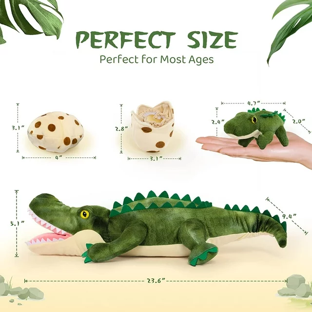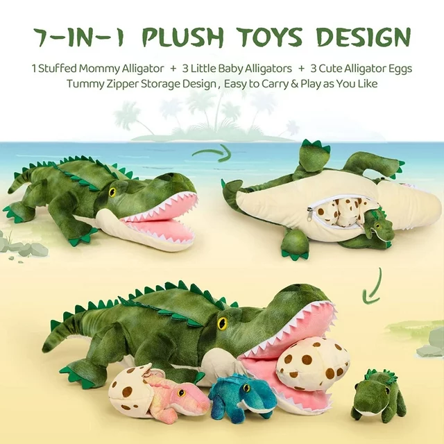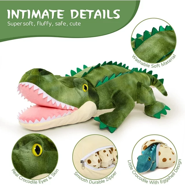 [PERFECT PARTNER] How fun to help the 23.6''mommy large alligator hatch its 4'' baby crocodile eggs and get about 5'' mini crocodiles! These plush crocodile toys with cute faces, perfect size and belly zipper storage design are amazing! Perfect for all ages to play and carry around. Never worry about getting dirty. Hand or machine washable! Be assured to play, cuddle and sleep with your big alligator and mini alligator toys as you like