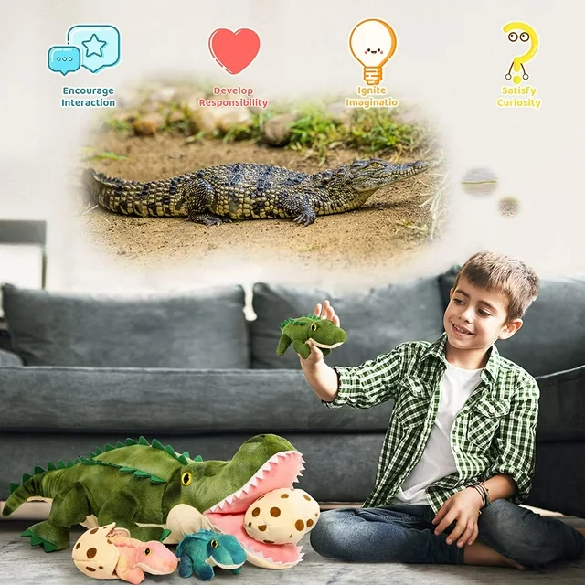 Get a happy alligator family: a stuffed mommy alligator and its 3 babies. Most kids will be attracted to these numerous colorful alligator toys at once. If you are an alligator lover, this unique mommy alligator with 3 baby alligator stuffed animals and 3 alligator eggs is exactly what you are looking for. Cute realistic alligator plush toys are ideal gifts for girls, boys, children, and girlfriends at any festival.