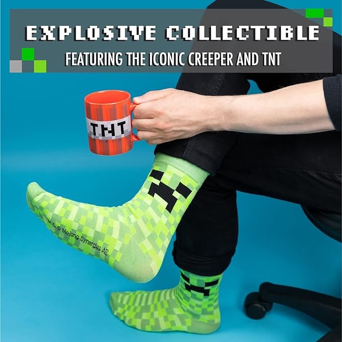 Unique TNT & Creeper Design: Display your love for this famously pixelated video game with this gift set that features a pair of unisex Creeper socks and a TNT design ceramic mug.