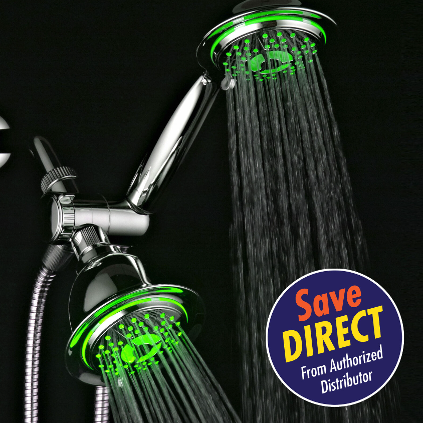 Connects in Minutes without Tools, Both Showerheads Feature Hydro Supercharged Turbine LED, No Batteries, Powered by Running Water, 4-Inch Face, Limited 1-year Warranty., Color of LED Lights - 7 Colors, 5 ft. Stainless Steel Hose, LED Lights Powered By Running Water, Adjustable Angle, High Pressure, LED Colors Gradually Blend Into One Another