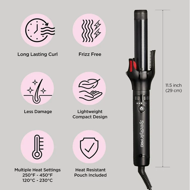 Bring the professional look of the hair salon into your home by creating flawless curls in a fraction of the time with our SpinStyle PRO Automatic Curling Iron -1 Inch . Automatic rotating carousel with smooth curl technology makes it easier than ever to wrap your hair around the ionic ceramic barrel while avoiding heat damage and frizz. Heats up quickly and safely with 5 adjustable temperature settings, making it the perfect tool for any hair type. No tangly clamps like an old-fashioned curling iron that grabs onto your hair and makes a frazzled mess. Patented smoothing comb detangles your hair as you style, while the silicone tabs press your hair neatly against the barrel for a smooth finish. Bi-directional spinning wand allows you to curl inward or out with the touch of a button. Curl small or large sections of hair for a versatile looking style. Ergonomically designed with easy one-touch controls so you can do all your styling with one hand. More lightweight and compact than ever, so you can take it with you wherever you go for a quick touch up, or on your next business trip or vacation. Get long-lasting curls thatll stay perfect from day to night. Put the stylist in your hands and achieve salon-quality results every time with this state-of-the-art automatic curling wand.