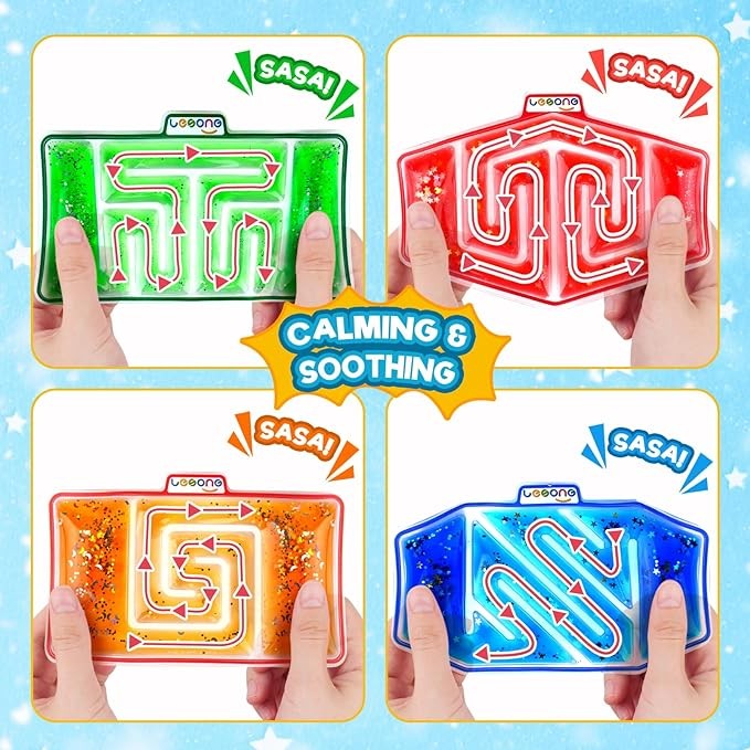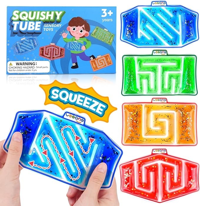 • 【4 Pack Squishy Fidget Sensory Toys】Squishy sensory toys not only have a twisted maze-like design, but they are also filled with a one-of-a-kind mixture of goo, glitter, and beads that rush and gush back and forth with every squeeze.Our adorable kids sensory toy showcases a mesmerizing flow of liquid accompanied by the delightful "sasa" sound of colliding beads.