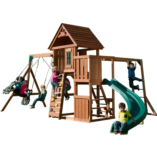 Swing-N-Slide Cedar Brook Wooden Backyard Play Set with Monkey Bars, Swings, Climbing Wall, and Curved Slide