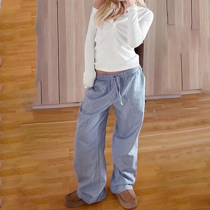 Tsultryofs Women Y2K Striped Long Pants Drawstring High Waist Wide Leg Trouser Casual Relaxed Fit Straight Lounge Pants