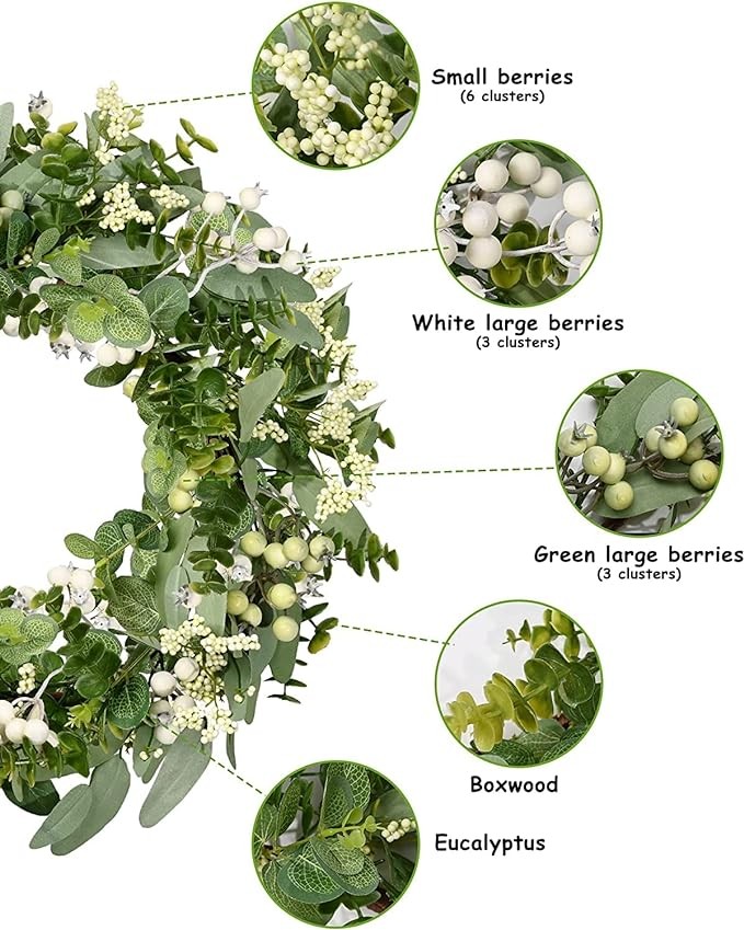 • 【Full and realistic】 Vlorart's handmade green eucalyptus wreath features eucalyptus leaves, boxwood, white/green berries, andmany small berries embellishedon it, making the wreath full, natural and realistic. Its elegance add a vibrant and pleasant vibe to your home.
