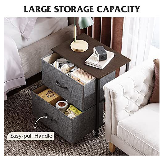 • SPACIOUS STORAGE: The 2 fabric drawers of the small dresser offer large storage space for nighttime necessities. The wood top is ideal to place alarm clock, phone, charger, eyeglasses, keeping them in your reach.