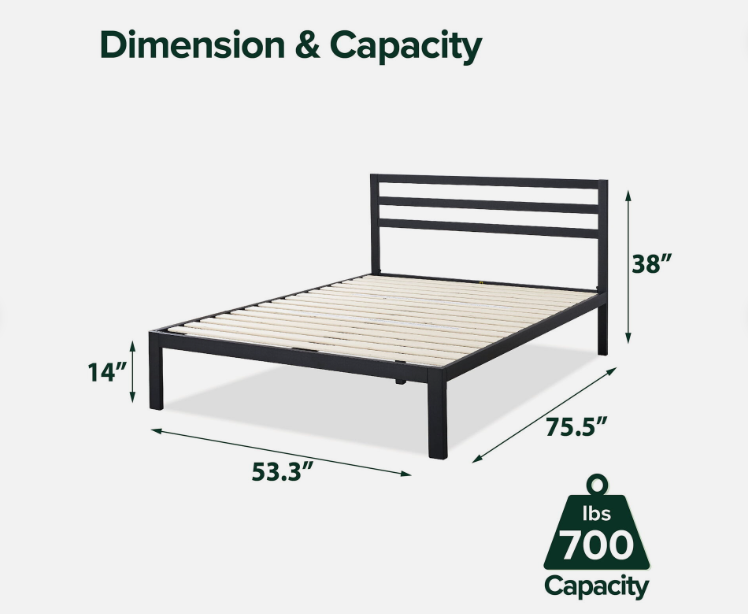 Made with bold style and optimum strength, the steel framed Mia Platform Bed with Headboard features a thick black metal frame and wooden slats that provide strong support for your memory foam, latex or spring mattress without the need for a box spring. And at 14 inches high, it offers over a foot of clearance under the frame for valuable under bed storage so you can tuck your extra boxes or bins neatly away. Crafted with clean lines and a streamlined look, this contemporary modern design looks classic and composed in just about any home. We ship this bed and everything you need to seamlessly assemble it in one slim and compact box that arrives at your doorstep. It’s all ready to be set up in under an hour with the help of a friend. And best of all, it includes a 5-year worry-free warranty guaranteed to keep you from ever losing any sleep over this purchase. Who would have guessed that stylish and strong mattress support could be this simple, convenient and affordably priced?